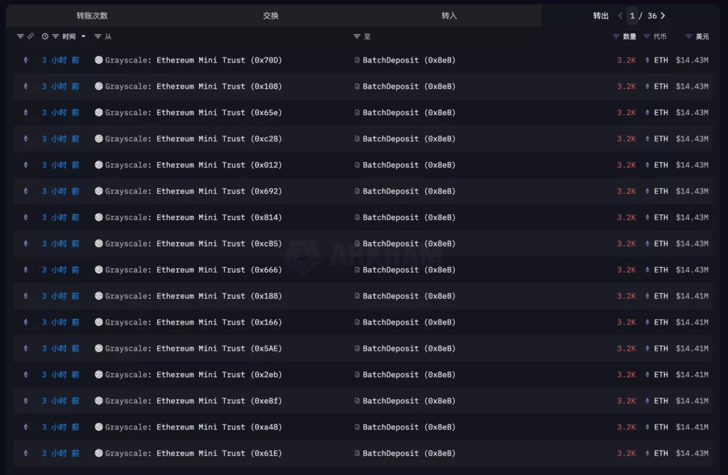 9일 온체인 분석 계정 엠버에 따르면, 디지털자산 운용사 그레이스케일이 운용하는 두 종의 이더리움(ETH) 현물 상장지수펀드(ETF)가 3시간 전 추가로 85만7600개의 이더리움(약 5조4300억원)을 예치했다.